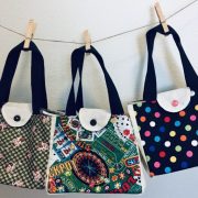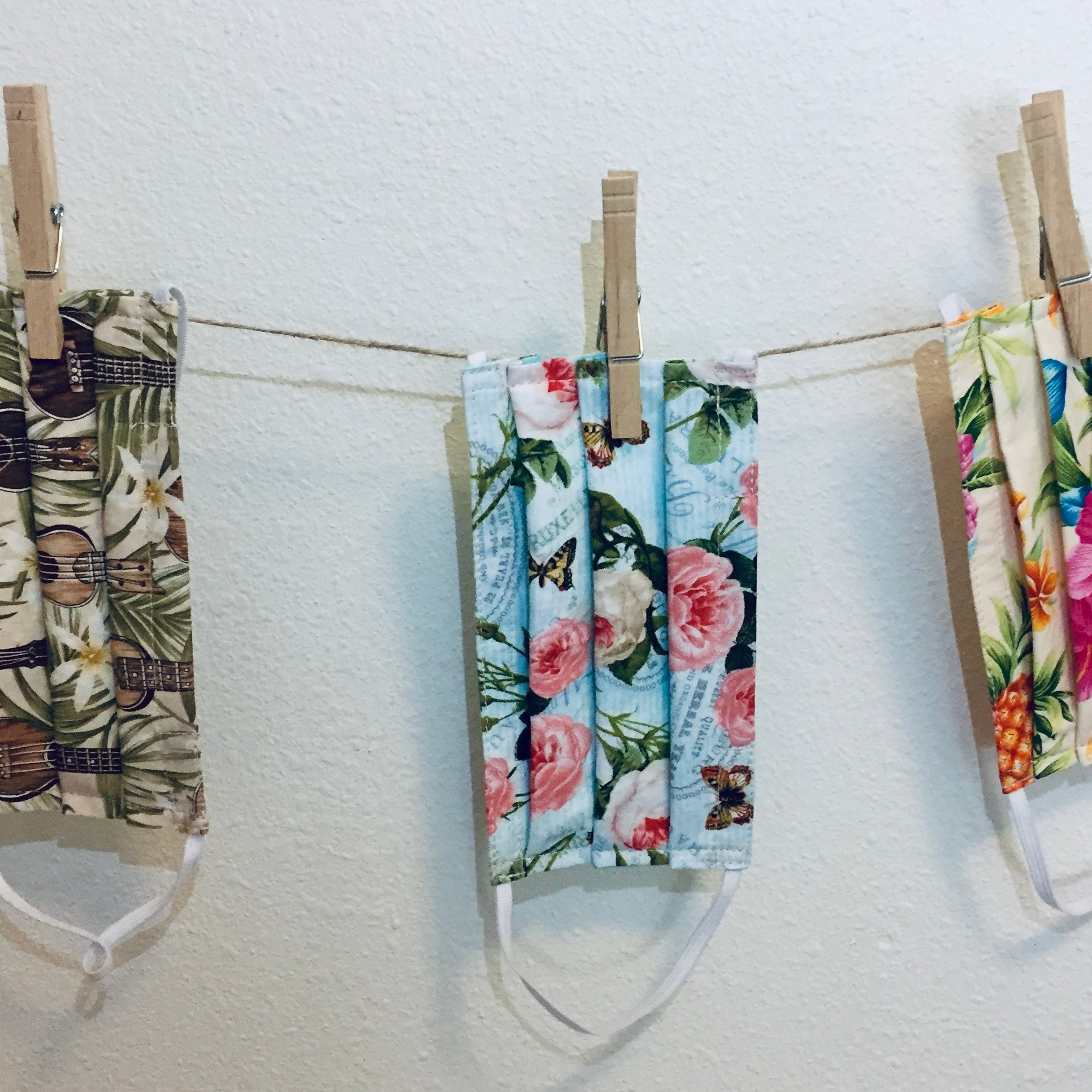 A recent addition to her collection are 100% cotton, washable fitted and pleated face masks in adult and child sizes, offered at $4.00 each. To sustain this affordable price, the Bag Lady chooses fabric selections at her discretion with input from the customer.